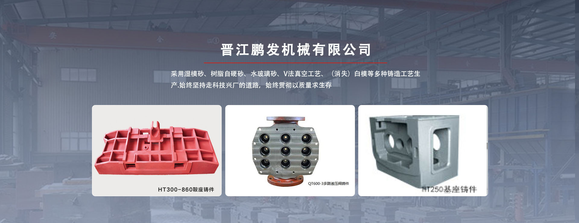 鵬發(fā)機械鑄造生產鞋機、大圓針織機、液壓機、數控機床、CNC加工中心配件。鵬發(fā)機械鑄造采用濕模砂、樹脂自硬砂、水玻璃砂、V法真空工藝、(消失)白模等多種鑄造工藝生產。鑄件材質有:多種牌號灰口鑄鐵、多種牌號球墨鑄鐵、鑄鋼件,同時也生產低合金鋼、高錳鋼等材質鑄件。員工120人,其中技術人員12人。具有雄厚的技術力量、先進的檢測儀器及完善的管理體系。現有設備:2T中頻感應電爐3套6爐,雙臂樹脂自硬混砂機3套,S114混砂機3套,V法真空鑄造生產線造型工作臺6站,拋丸、水力清理鑄件5套,退火設備1條,爐前鐵液質量管理儀,高頻紅外碳硫分析儀,微機高速分析儀,熔煉測溫儀,布氏、洛氏硬度計,金相、拉力試驗機,光譜儀等生產、檢測設備齊全。